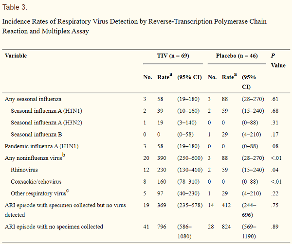 You can see the increased number of respiratory infections in this chart. Note the “TIV” column means those children who were vaccinated with an influenza vaccine: